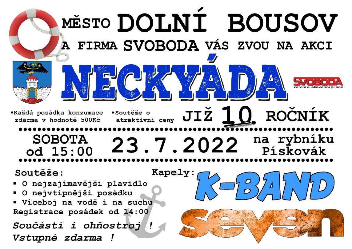 Neckyáda 2022 Published 25.7.2022 | By admin 10. ročník Neckyády na rybníku Pískovák – 23. červenec 2022 v Dolním Bousově